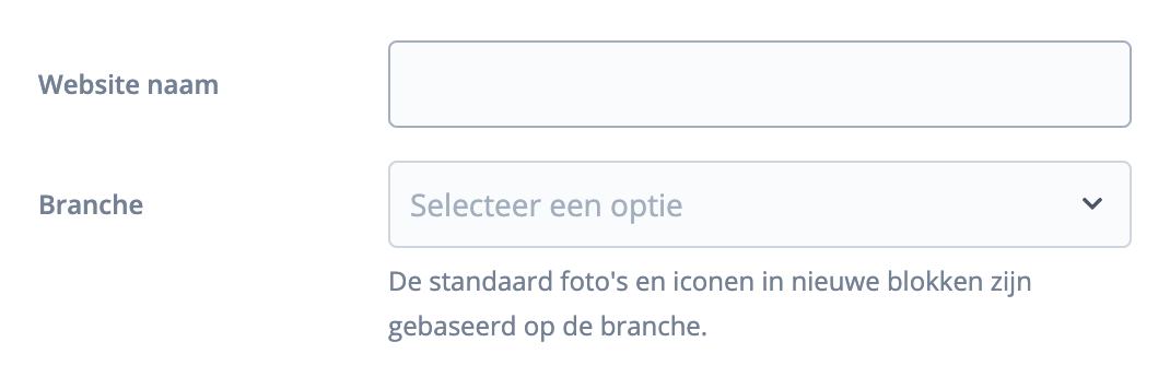 Kies de branche welke past bij de te ontwikkelen website. Op basis van jouw keuze worden bijhorende foto's getoond in de blokken. Uiteraard kun je deze naar wens aanpassen.