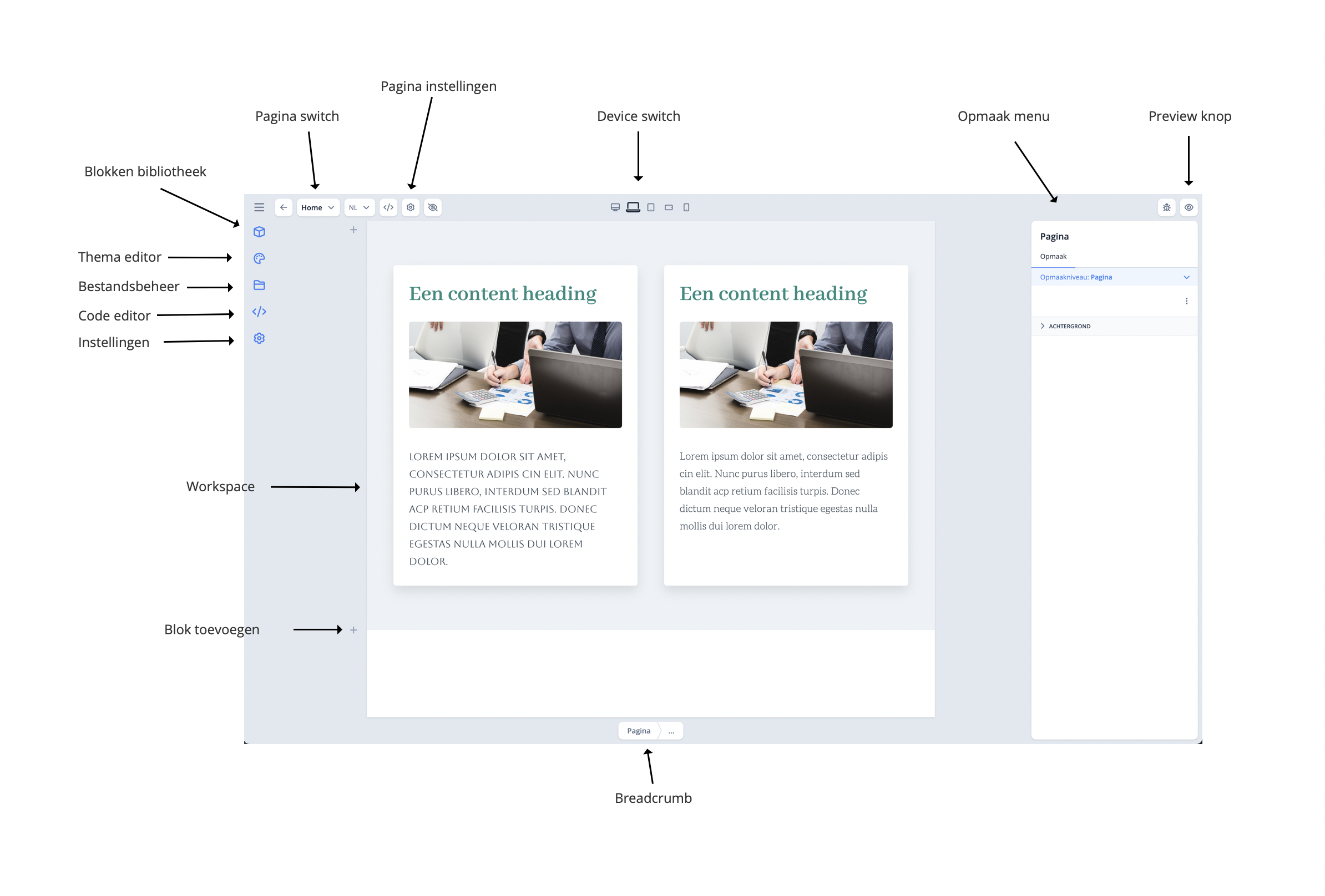 Hieronder staat de uitleg per onderdeel van de editor zoals hierboven weergegeven.