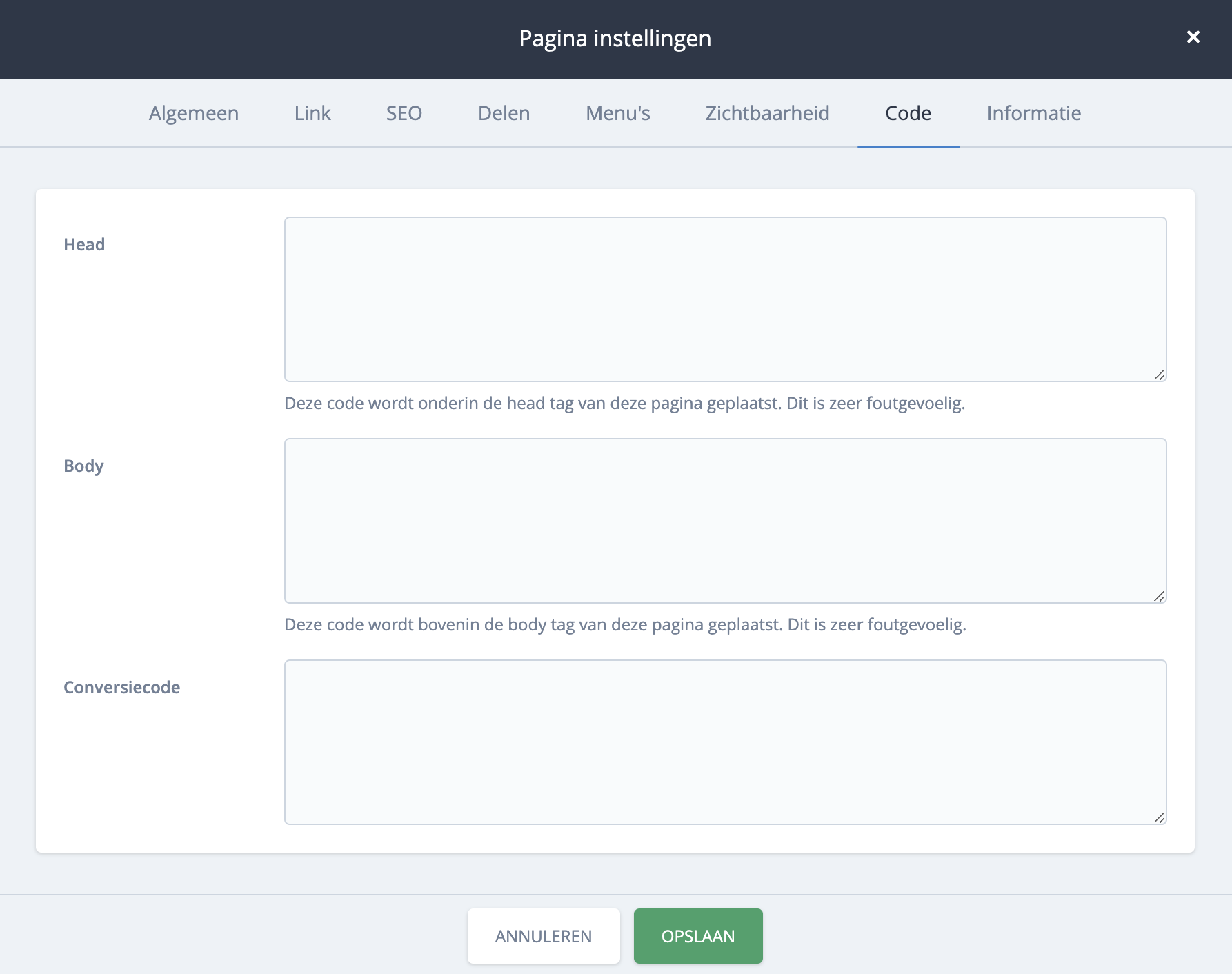 Scripts welke bij de pagina-instellingen onder tabblad "code" worden ingevoerd in het vakje "conversiecode' worden ook geblokkeerd wanneer de bezoeker niet akkoord is gegaan.