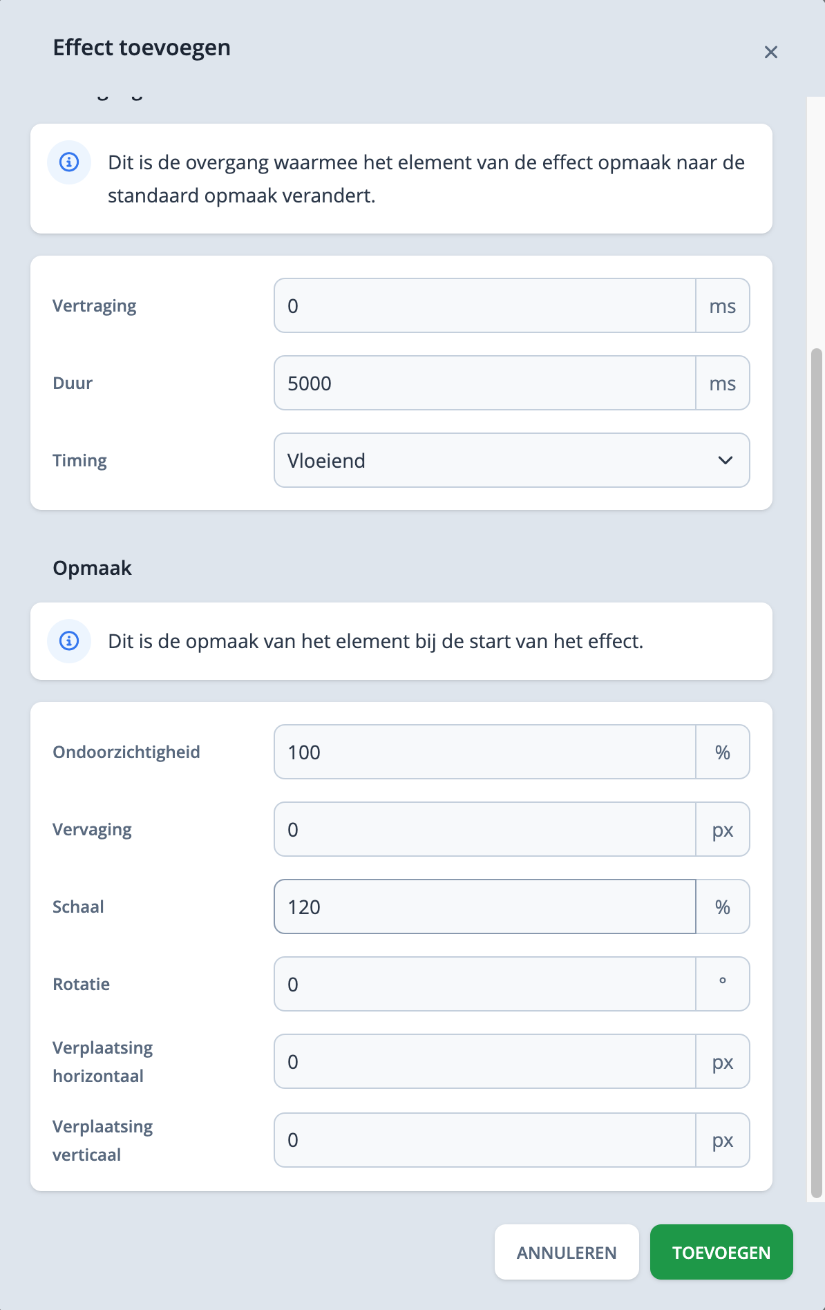In Bureau van den Oever kun je met effecten dynamiek toevoegen aan websites. Alle effecten werken op basis van CSS. Hierdoor zijn effecten vloeiend en supersnel. De tijdsduur van effecten wordt gemeten in milliseconden (ms). 1 seconde is 1000 milliseconde.