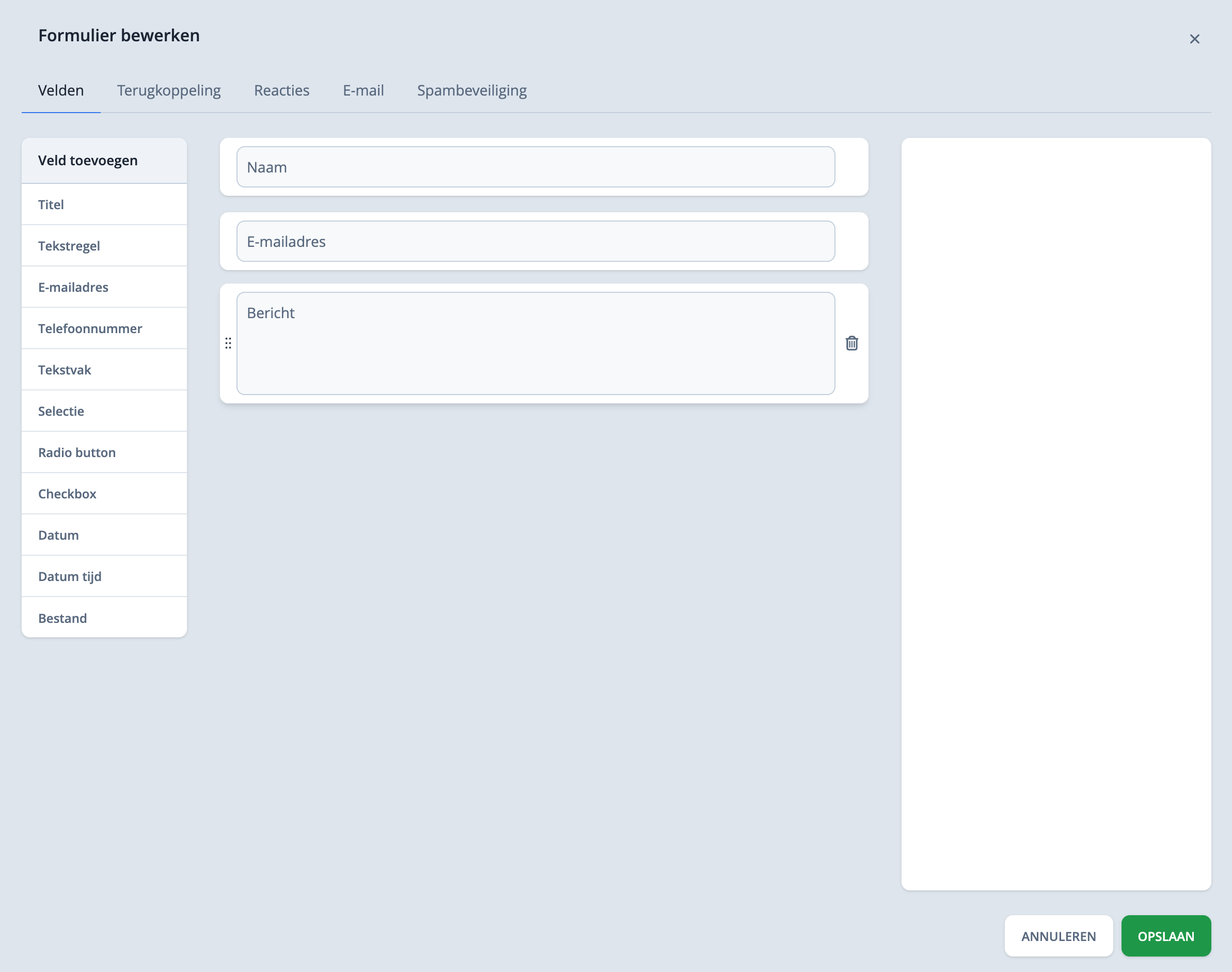 Links op het scherm staan de verschillende formuliervelden. Klik op een veldtype om deze toe te voegen aan het formulier. De velden kunnen vervolgens in de juiste volgorde worden gesleept.