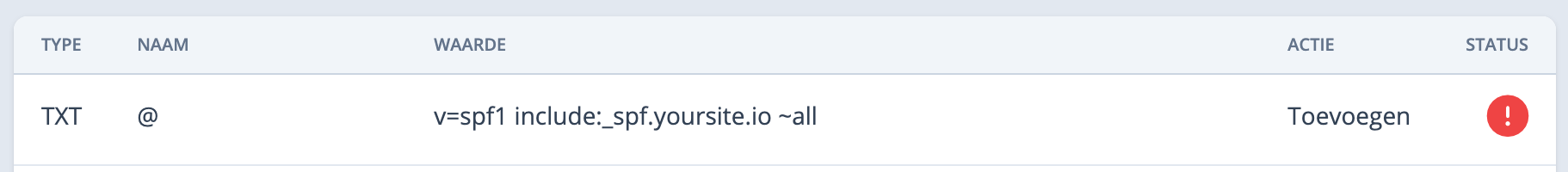 Om de kans te vergroten dat de mailprovider van de ontvanger de mail accepteerd en niet aanmerkt als SPAM dient een SPF record te worden toegevoegd aan de DNS van de website/domeinnaam. De instructies voor het toe te voegen record worden getoond in Bureau van den Oever onder de "DNS" van de website.