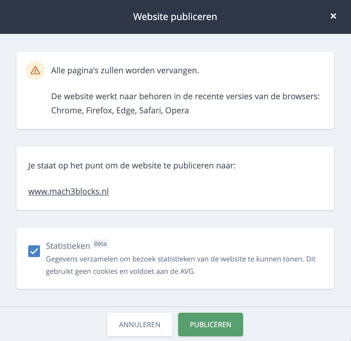 Tijdens het publicatieproces krijg je de keuze om statistieken aan te zetten. Dit scherm ziet eruit zoals hieronder weergegeven. Vink de optie "Statistieken" aan.