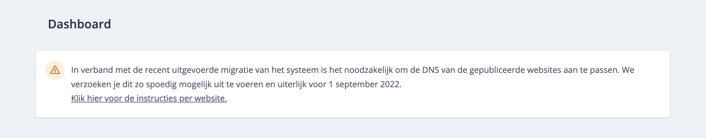 Door de migratie welke heeft plaats gevonden op 3 juni (00:00 uur) dient de DNS van gepubliceerde websites te worden aangepast. Op het dashboard van jouw Bureau van den Oever account vind je instructies voor het aanpassen van de DNS per gepubliceerde website. Wanneer de DNS van een website is aangepast zal deze automatisch van het overzicht verdwijnen. Dit kan maximaal 24 uur duren in verband DNS caching.