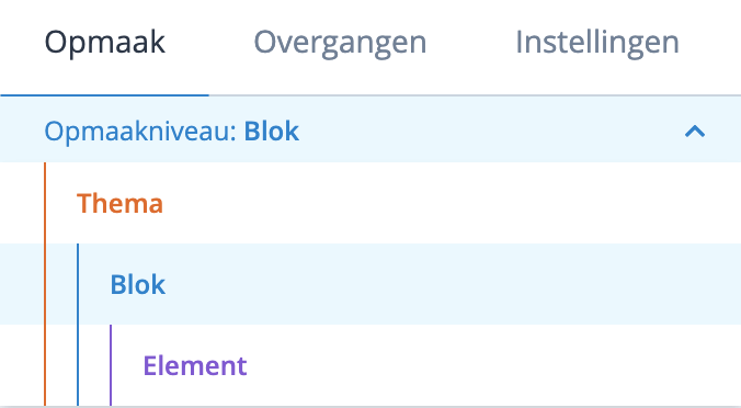 Wil je een element in één keer vormgeven voor de gehele website dan selecteer je niveau "thema". Op die manier kun je supersnel de gehele website voorzien van de stijl welke jij wenst. Heb je echter specifieke wensen voor een bepaald element op de pagina dan kun je deze uniek stijlen voor dat ene element. In dat geval selecteer je niveau "element".